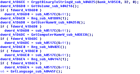 권한 상승 이후에는 랜섬웨어의 역할을 수행한다. 암호화 바이너리 생성 뒤에 볼륨 정보, 유저명, 컴퓨터명, 사용하는 언어 정보 등을 가져온다. 또한 이 과정에서 레지스트리 등록도 하게되는데 해당 레지스트리 등록은 암호화 수행에 있어 필요한 값들을 저장한다.