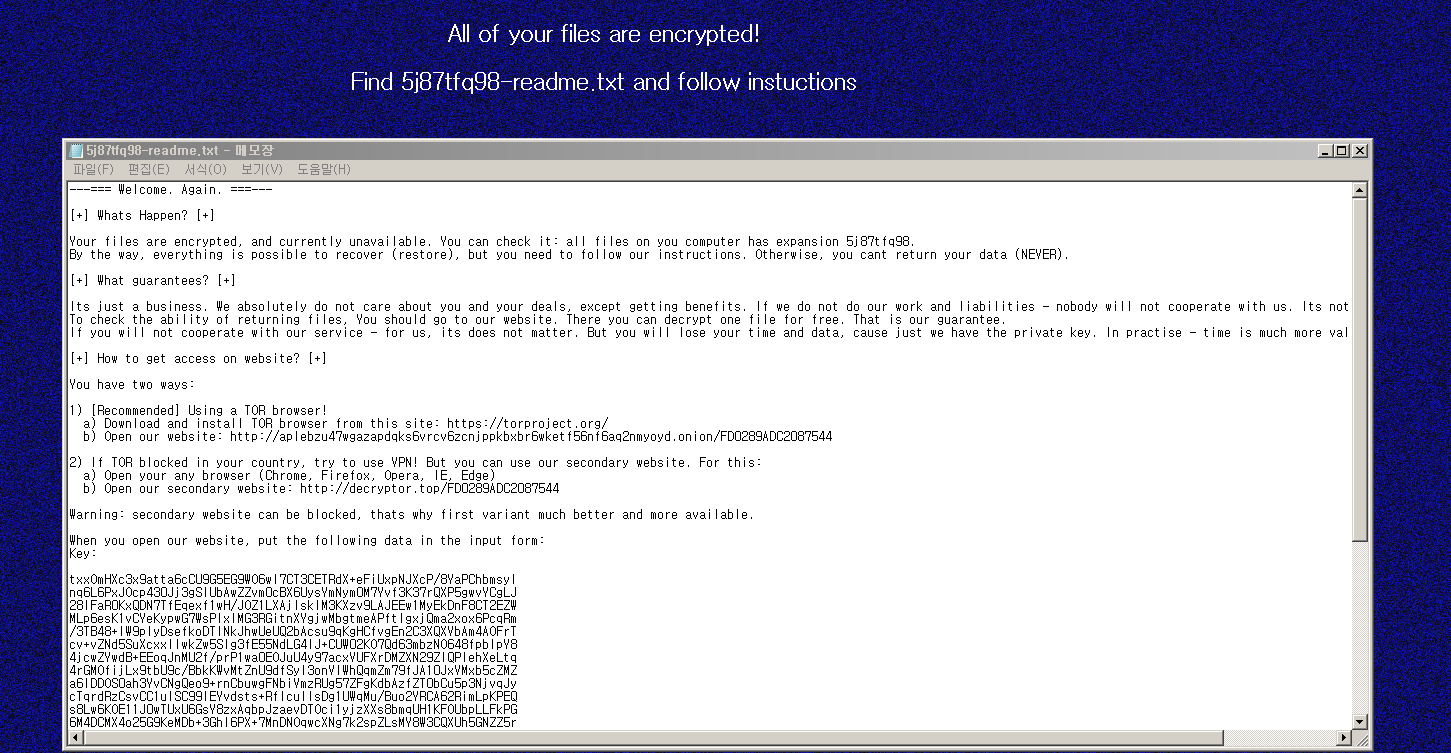갠드크랩이 V5.2 이후로 업그레이드가 안되고 자취를 감춘 현재, 갠드크랩과 상당히 유사한 랜섬웨어가 활발히 유포되고 있다.