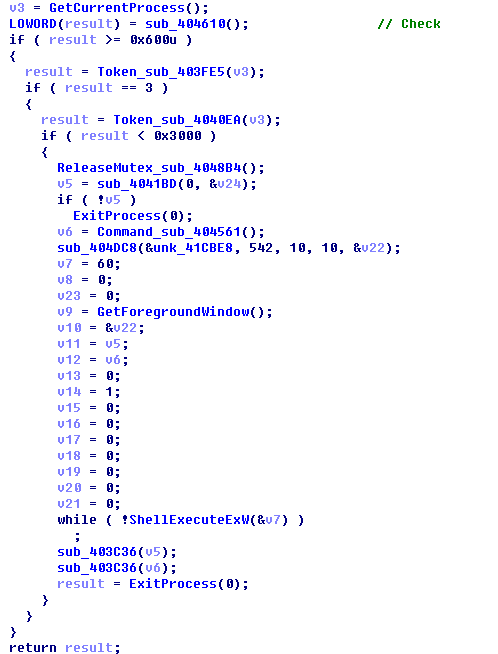 체크 루틴을 거쳐서 두 개의 메인 역할을 하는 함수 중 첫번째 함수로 진입하게되면 뮤텍스를 활성화 시키고 명령어를 받아오는 등의 행위를 한다. 프로세스 토큰 정보를 통해서 행위를 수행할지를 결정하게 되는데 확인해본 바로는 애초에 토큰 검사 이후 행위들은 안되도록 설계해둔 것 같다.(암호화는 다른 함수에서 수행한다.)