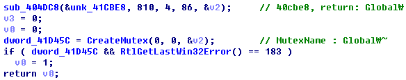 소디노키비 랜섬웨어는 제일 먼저 대부분 랜섬웨어가 그렇듯 중복실행 방지를 위해 뮤텍스를 생성한다. 뮤텍스 명은 Global\~ 로서, 모든 터미널 세션에 적용되도록 한다.