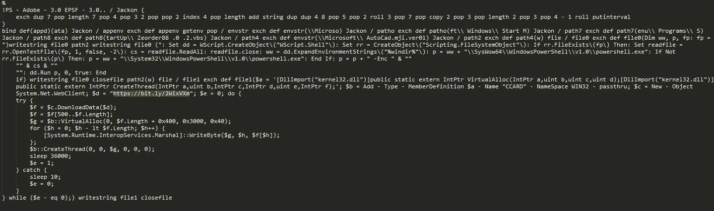 해당 문서의 EPS 부분을 살펴보면 아래와 같은 코드들을 확인할 수 있다. 해당 코드들 내부에는 BASE64로 인코딩 된 쉘코드가 존재하며 해당 쉘코드가 실제 드로퍼 역할을 한다.