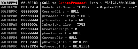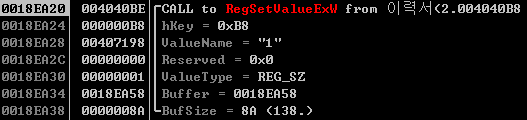 이후에는 레지스트리를 건드리기 시작한다. 먼저 자동실행과 관련된 Run 키를 열어서 해당 레지스트리에 악성코드를 세팅하고, 시스템의 재부팅시에도 악성코드가 자동실행되도록 설정한다.