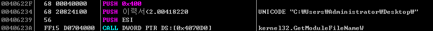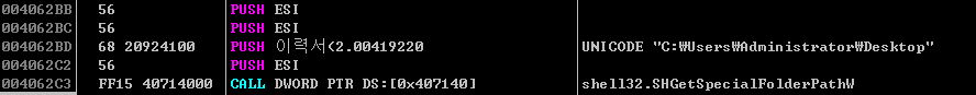 현재 프로세스, 즉 악성코드가 실행중인 경로에 대해서도 특정 함수를 통해 얻어오고 윈도우 상의 특수 폴더(바탕화면, 즐겨찾기 등)의 경로도 얻어온다.