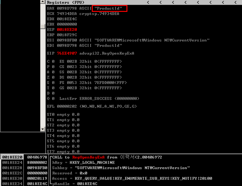 이후에는 레지스트리로부터 ProductId를 얻어온다. 아마 이 ProductId도 윈도우와 관련된 정보를 식별하기 위함인 것으로 보인다.