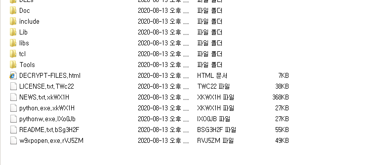 랜섬노트는 아래와 같이 생겼으며 암호화된 파일은 [본래파일명].[대소영문자+숫자5~7자리] 로 구성된다. 여기서 특이한점은 암호화 확장자명이 각 파일마다 다르다는 것이다.