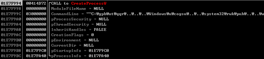 이후 사용할 함수, DLL 등이 모두 로드되면 WMIC 을 CreateProcess 함수를 통해 프로세스로 생성한다. 이유는 WMIC 프로세스를 통해서 명령등을 수행시키기 위해서로 보인다. 추가적인 악성코드를 다운로드해오거나 감염된 피해 PC 내에서 여러 명령을 수행할 수 있기 때문이다. Maze 랜섬웨어에서는 볼륨 섀도우 카피본 삭제를 위해 사용한다.